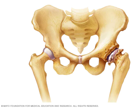 The hip joint shown on the left side of the image is normal, but the hip joint shown on the right side of the image shows deterioration of cartilage and the formation of bone spurs due to osteoarthritis.