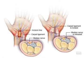 During carpal tunnel release, a surgeon makes an incision in the palm of your hand over the carpal tunnel ligament and cuts through the ligament to relieve pressure on the median nerve. The surgery may be done by making one incision on the palm side of the wrist.
