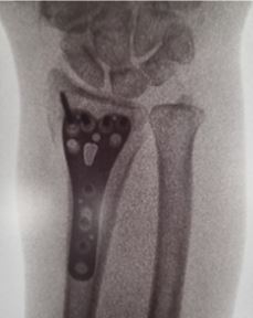 A titanium plate is inserted across the wrist fracture and stabilised with screws.